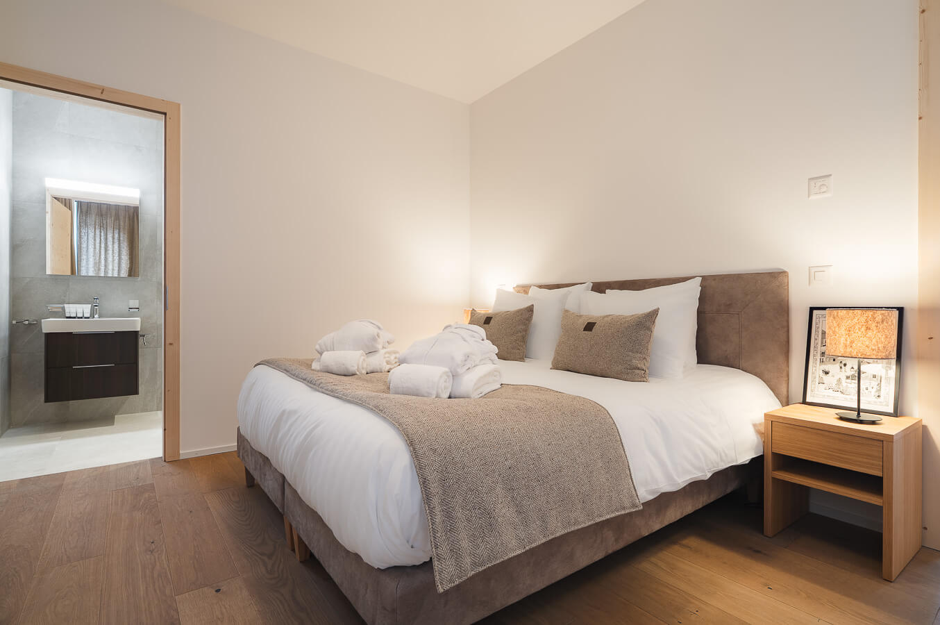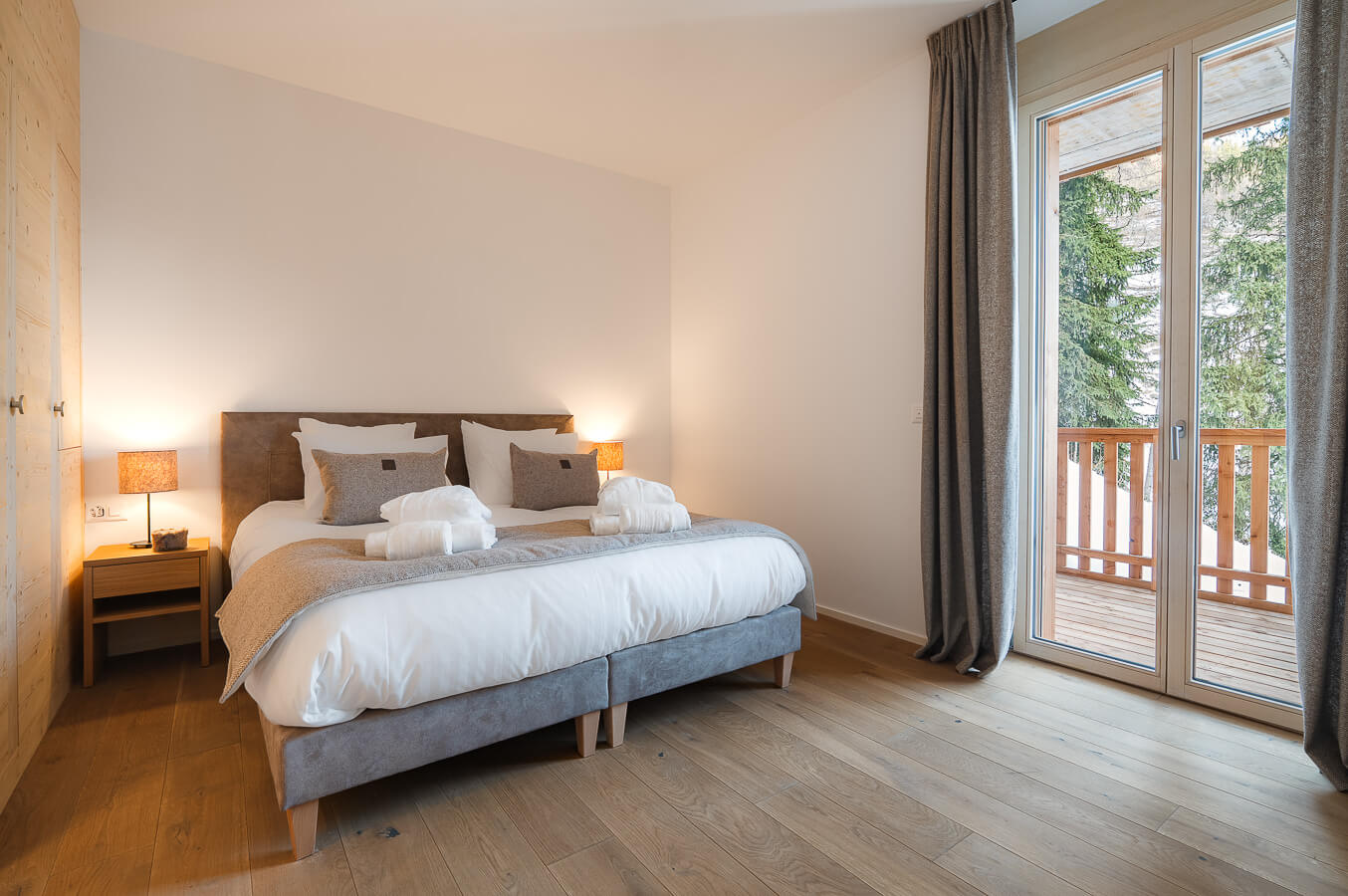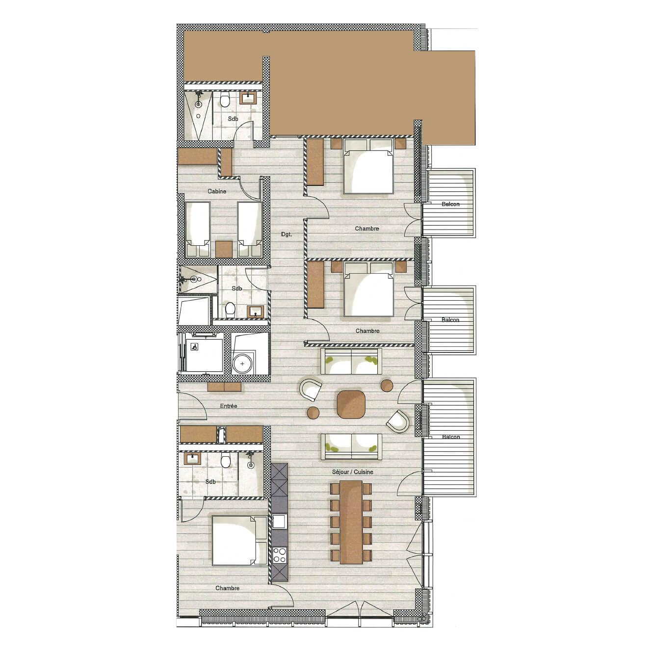 Diese Wohnung verfügt über drei Schlafzimmer mit Doppelbett (180 × 200 cm), ein fensterloses Schlafzimmer mit zwei Einzelbetten (90 × 200 cm) sowie über zwei Badezimmer. Der Wohnbereich bietet eine Sitzecke mit Fernseher und eine voll ausgestattete offene Küche. Möblierte Balkone ergänzen den Wohnraum. Zur Ausstattung der Wohnung gehören Haushaltsgeräte wie Geschirrspüler, Nespresso-Kaffeemaschine, notwendige Küchenutensilien usw.