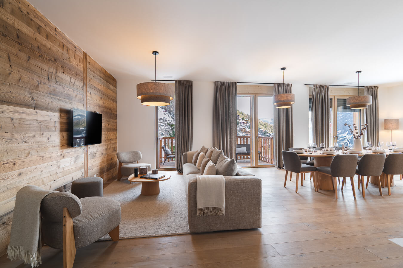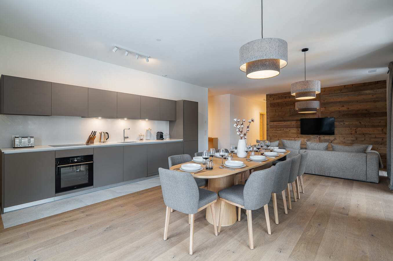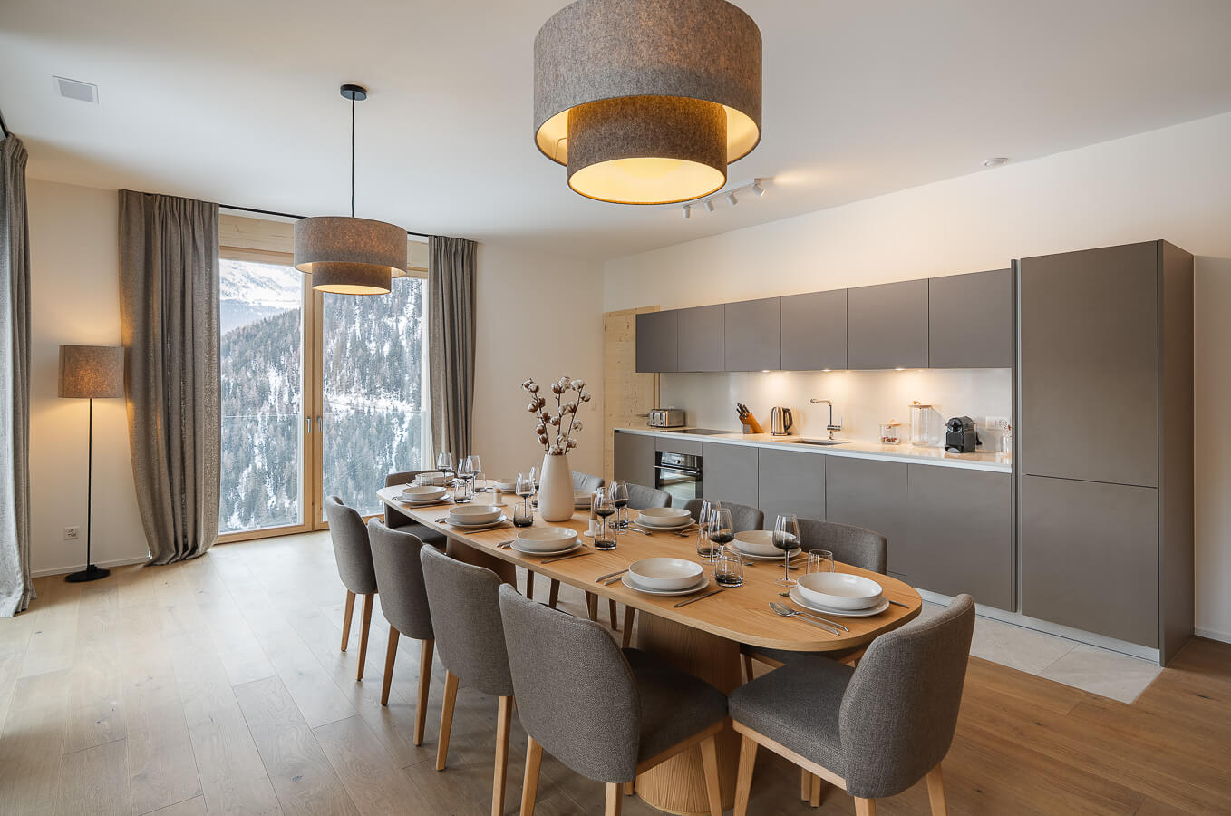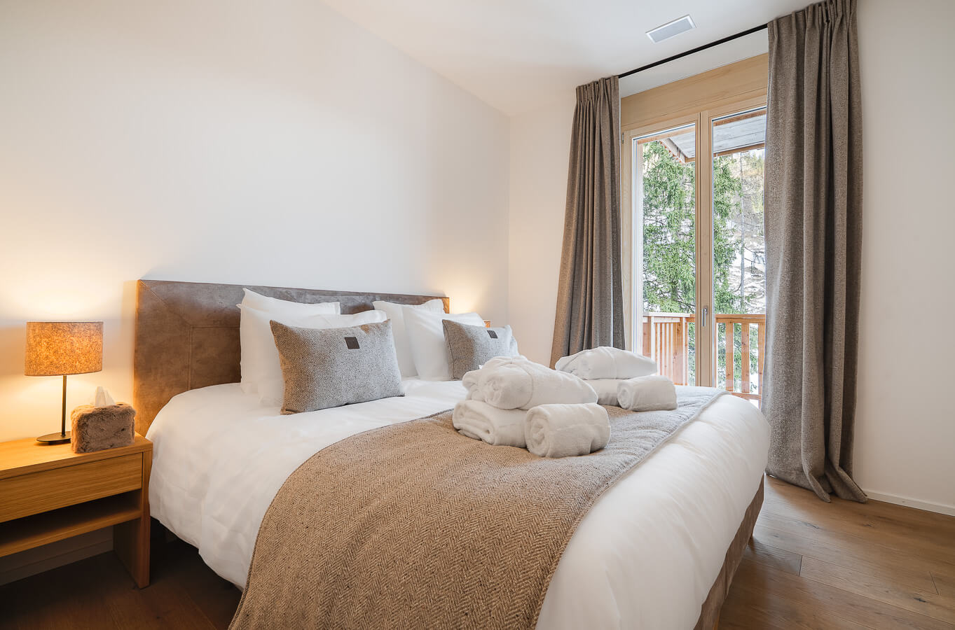 Diese Wohnung verfügt über drei Schlafzimmer mit Doppelbett (180 × 200 cm), ein fensterloses Schlafzimmer mit zwei Einzelbetten (90 × 200 cm) sowie über zwei Badezimmer. Der Wohnbereich bietet eine Sitzecke mit Fernseher und eine voll ausgestattete offene Küche. Möblierte Balkone ergänzen den Wohnraum. Zur Ausstattung der Wohnung gehören Haushaltsgeräte wie Geschirrspüler, Nespresso-Kaffeemaschine, notwendige Küchenutensilien usw.
