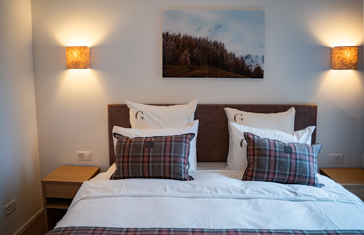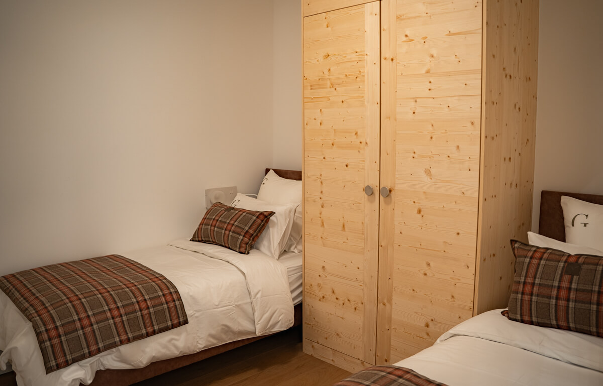 Diese Wohnung verfügt über zwei Schlafzimmer mit Doppelbett (180 × 200 cm), ein Schlafzimmer mit zwei Einzelbetten (90 × 200 cm) sowie über zwei Badezimmer. Der Wohnbereich bietet eine Sitzecke mit Fernseher und eine voll ausgestattete offene Küche. Eine möblierte Terrasse ergänzt den Wohnraum. Zur Ausstattung der Wohnung gehören Haushaltsgeräte wie Waschmaschine und Trockner, Geschirrspüler, Nespresso-Kaffeemaschine, notwendige Küchenutensilien usw.