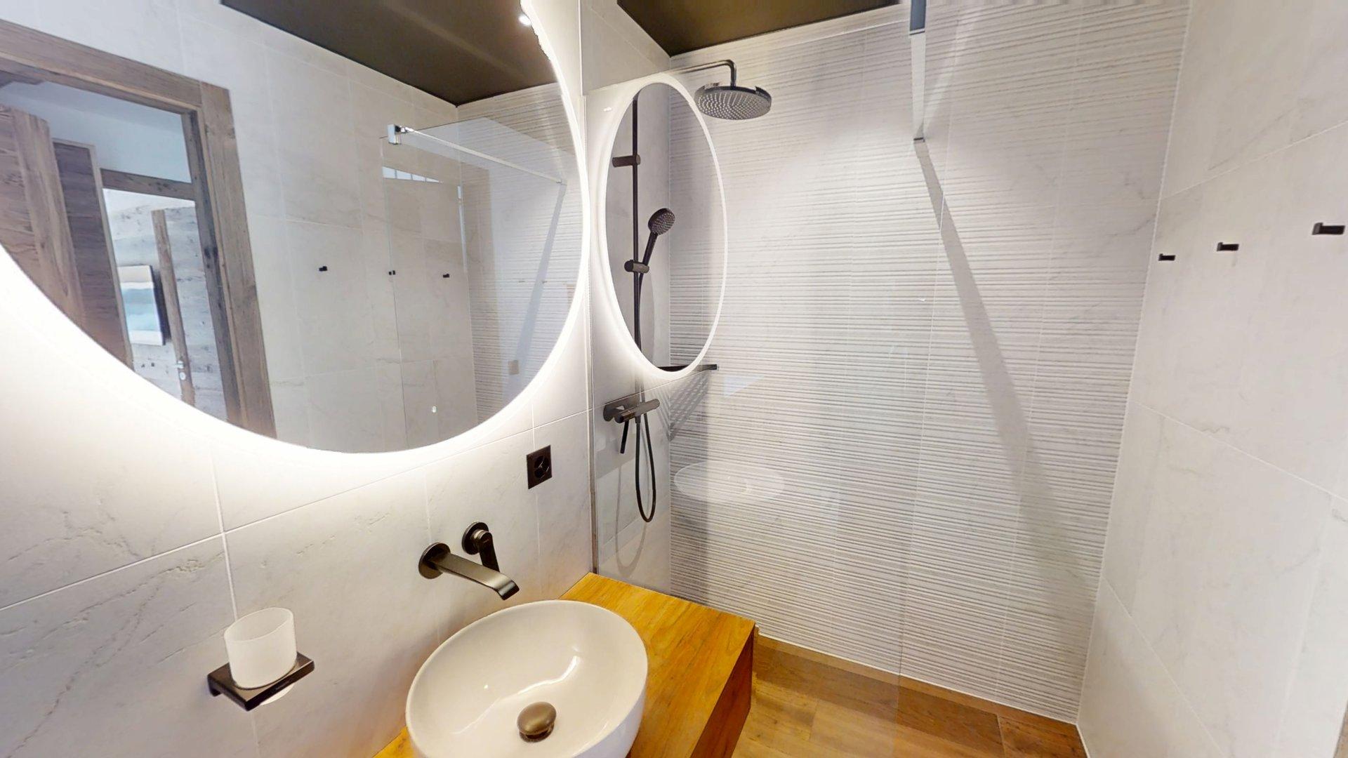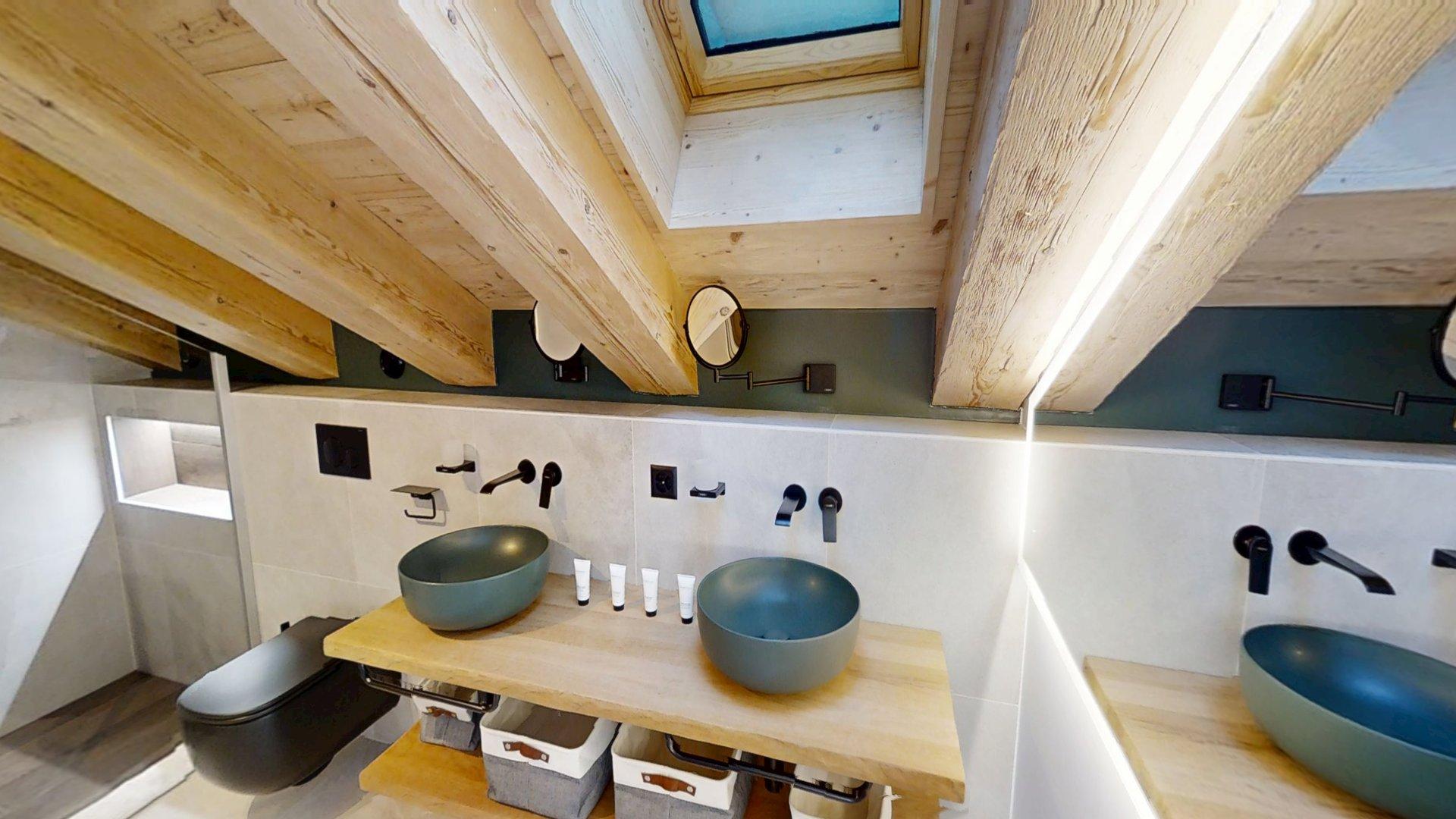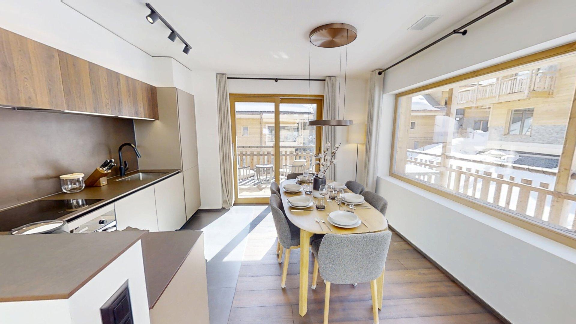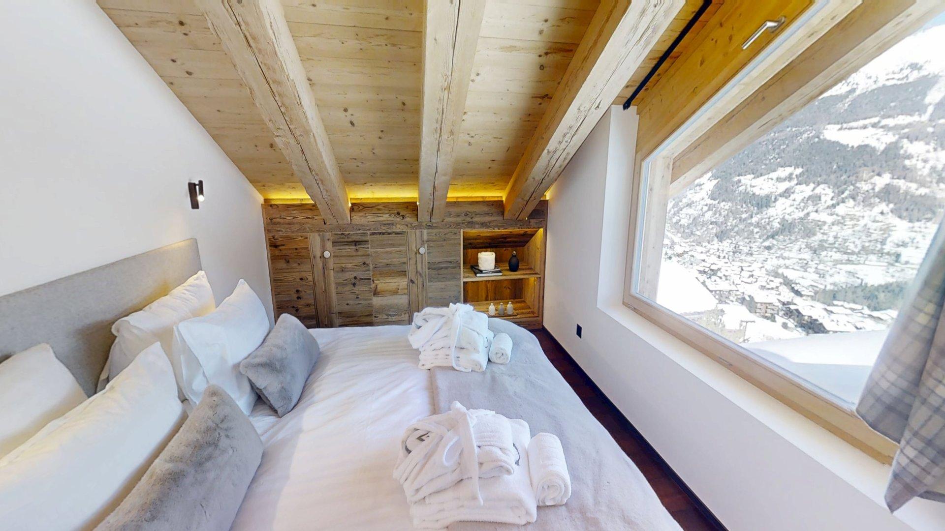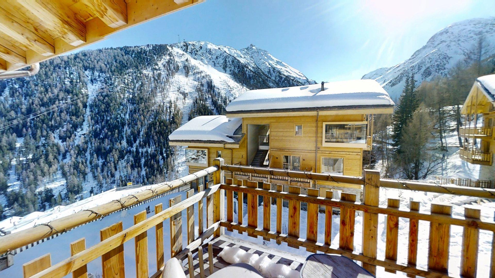 Diese Chalet-Wohnung verfügt über drei Schlafzimmer mit Doppelbett (180 × 200 cm) sowie über drei Badezimmer mit Dusche. Der Wohnbereich bietet eine Sitzecke, eine voll ausgestattete Küche, einen Holzofen und einen nach Südwesten ausgerichteten Balkon. Das Chalet ist nach allen Himmelsrichtungen ausgerichtet, sodass Licht und Aussicht sich im Laufe des Tages ständig ändern. Zur Ausstattung gehören Haushaltsgeräte wie Geschirrspüler, Nespresso-Kaffeemaschine, notwendige Küchenutensilien usw.