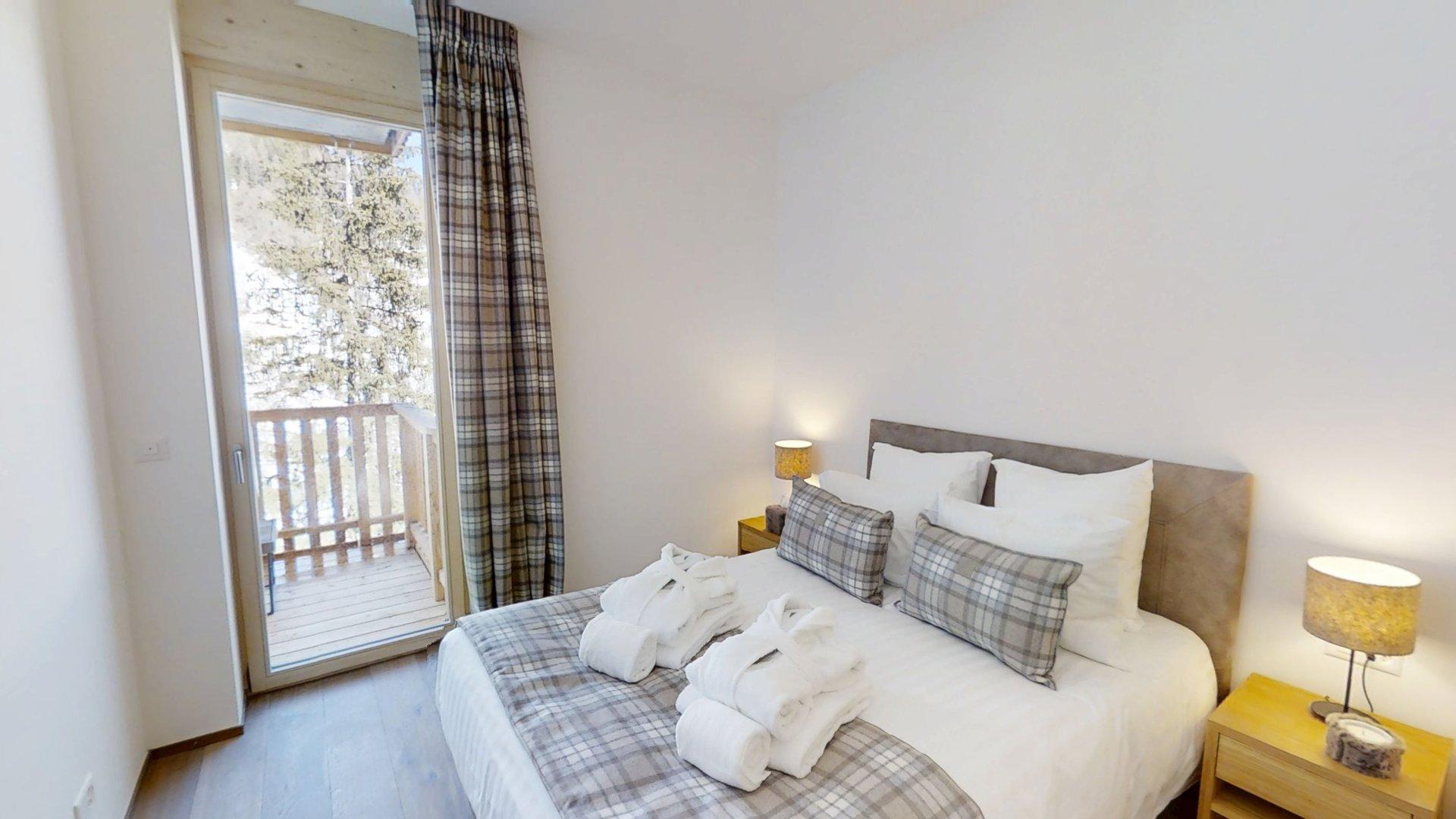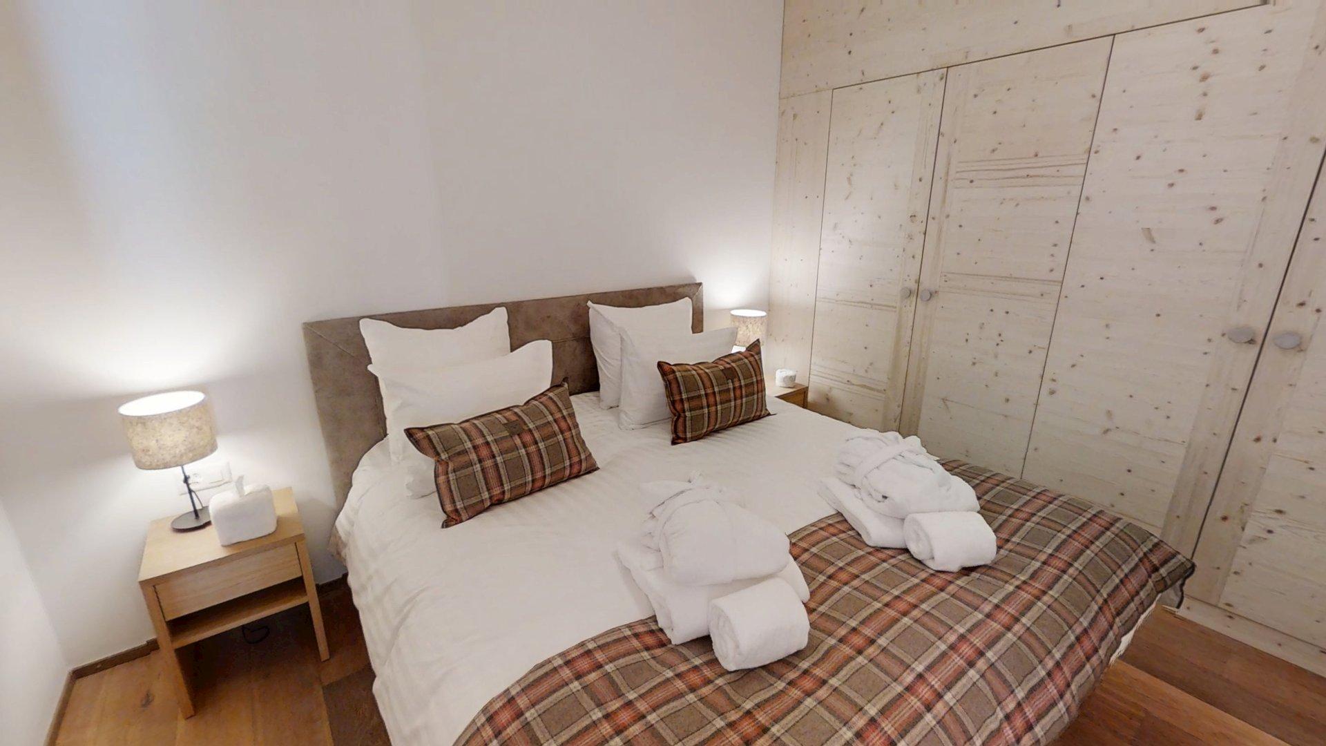 Diese Wohnung verfügt über zwei Schlafzimmer mit Doppelbetten (180 × 200 cm, 140 × 200 cm), ein fensterloses Schlafzimmer mit Doppelbett (180 × 200 cm), ein Kabinenschlafzimmer mit Etagenbett sowie über zwei Badezimmer. Der Wohnbereich bietet eine Sitzecke mit Fernseher und eine voll ausgestattete offene Küche. Möblierte Balkone ergänzen den Wohnraum. Zur Ausstattung der Wohnung gehören Haushaltsgeräte wie Waschmaschine, Geschirrspüler, Nespresso-Kaffeemaschine, notwendige Küchenutensilien usw.